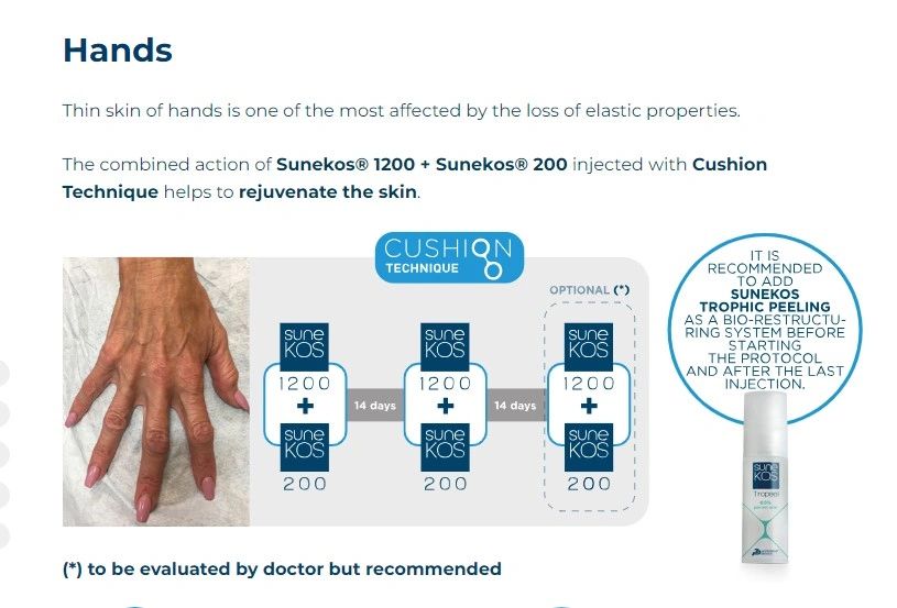 Sunekos is a brand of injectable aesthetic treatments designed to rejuvenate and regenerate the skin. It contains a patented formula that combines hyaluronic acid with a mixture of amino acids, which are the building blocks of collagen and elastin. Sunekos is intended to stimulate the natural production of collagen and elastin in the skin, promoting tissue regeneration, and improving skin elasticity. It is often used to address facial aging, including fine lines, wrinkles, and loss of skin firmness. As with any aesthetic treatment, it should be administered by qualified healthcare professionals